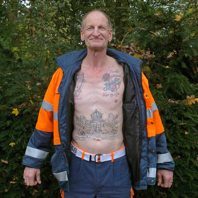 Geloof, hoop en liefde : deze tattoo is ter nagedachtenis van zijn vrouw Marrie. ‘De tatoeage Het gebed, met de gevouwen handen, geeft me kracht. En de onderste tatoeage, op mijn buik, is het wapen dat keizer Napoleon ooit aan de gemeente Amsterdam schonk. Alleen heb ik het wapen van Apeldoorn erin gezet, want daar ben ik geboren. Maar wel met het Amsterdamse motto. Want vastberaden, heldhaftig en barmhartig ben ik zeker!’