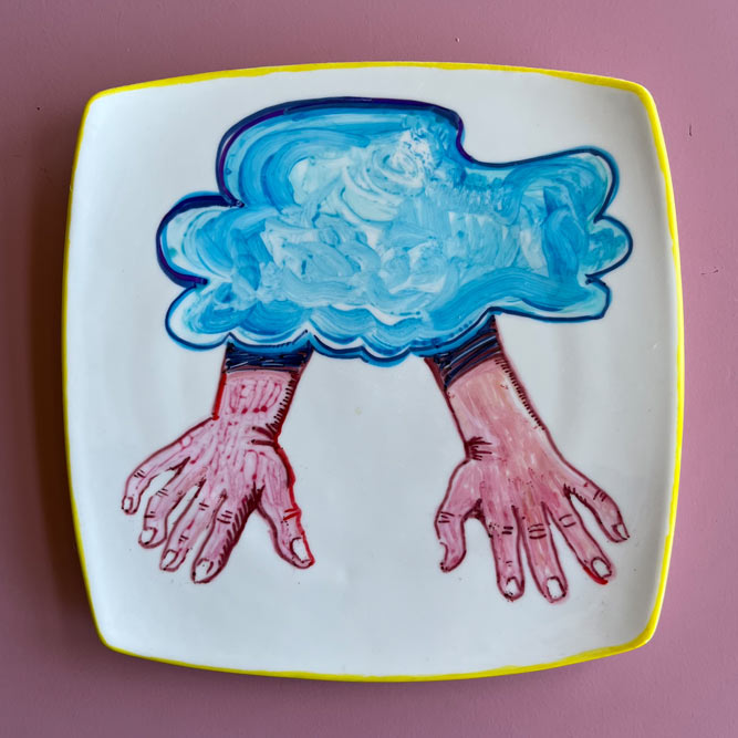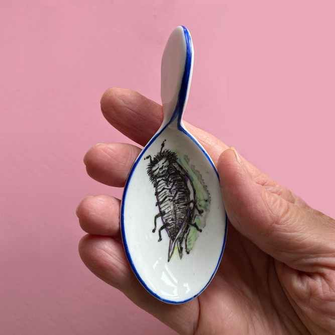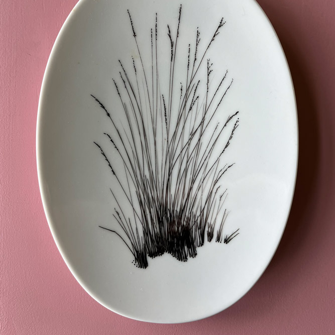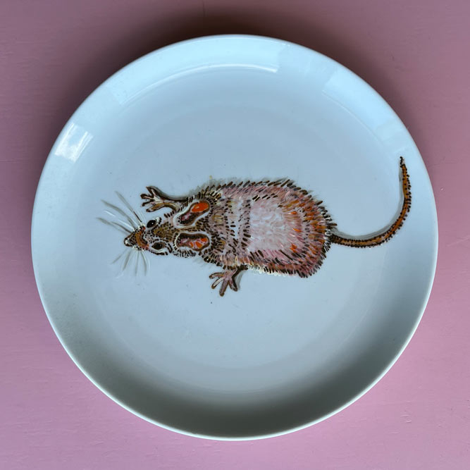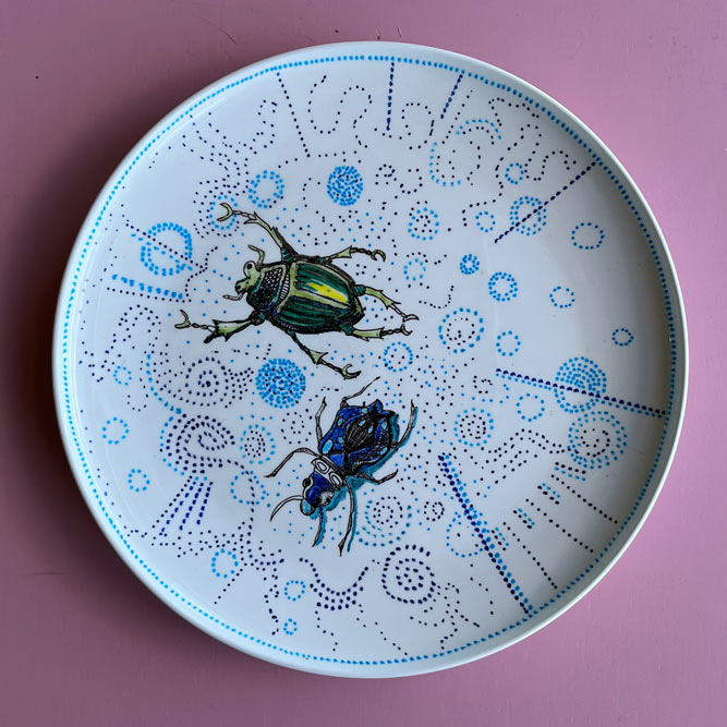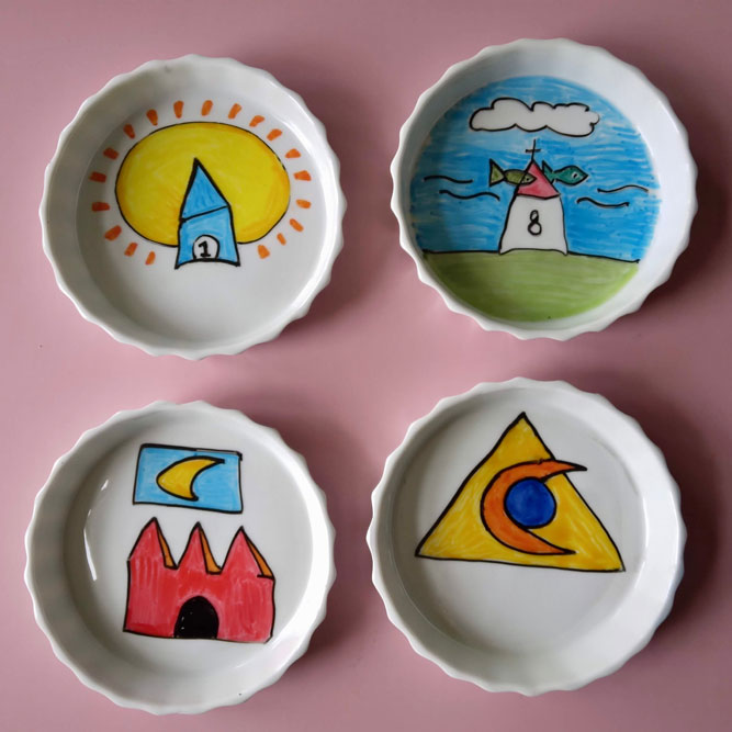 Bij de kringloop of elders gevonden keramiek is met speciaal daarvoor geschikte stiften of verf versierd.